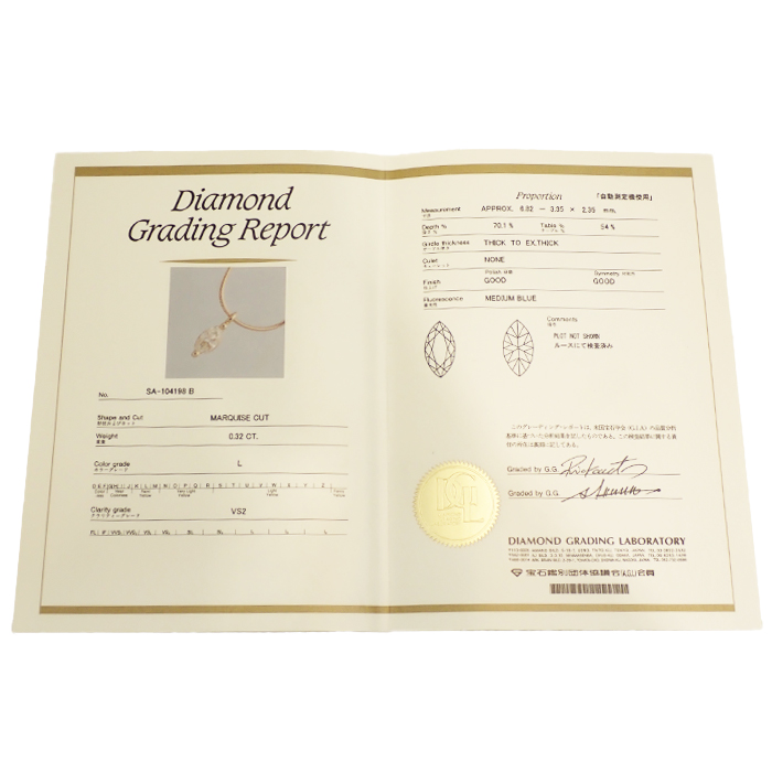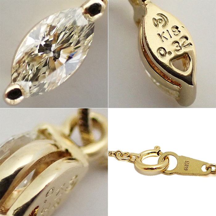 詳細 | 0.32ct(L-VS2-MQ) 3.2g トップ取外し不可 ※宝石には10倍のルーペで確認できる天然特有のインクルージョンがあります。 ※K18に小傷・くすみがあります。またチェーンには歪みがございます。 |