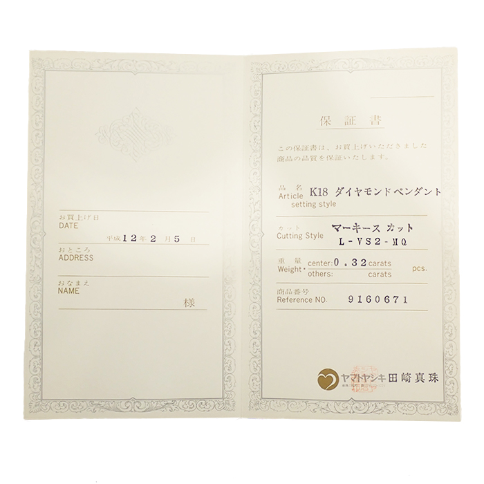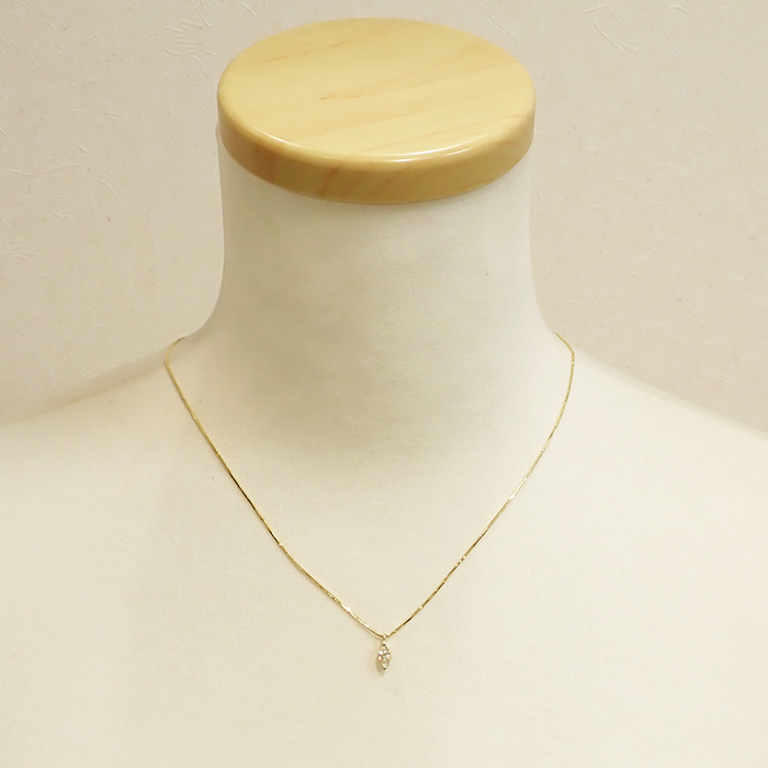 詳細 | 0.32ct(L-VS2-MQ) 3.2g トップ取外し不可 ※宝石には10倍のルーペで確認できる天然特有のインクルージョンがあります。 ※K18に小傷・くすみがあります。またチェーンには歪みがございます。 |
