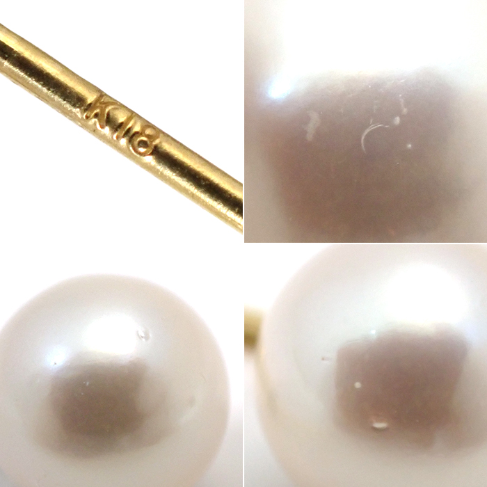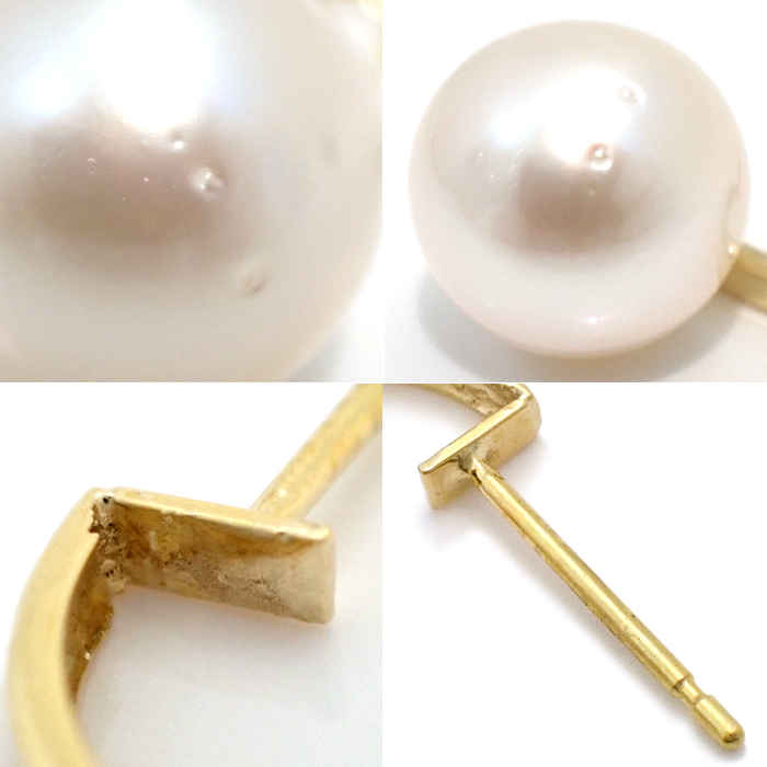 | 詳細 | パール:約9.0mm 重量:2.7g スタッドピアス(キャッチ式ピアス) ※パールには10倍のルーペで確認できる天然特有のエクボや僅かなスレなどがあります。 ※K18には僅かなくすみなどがあり、ポストの高さ(位置)が左右で若干異なります。 |